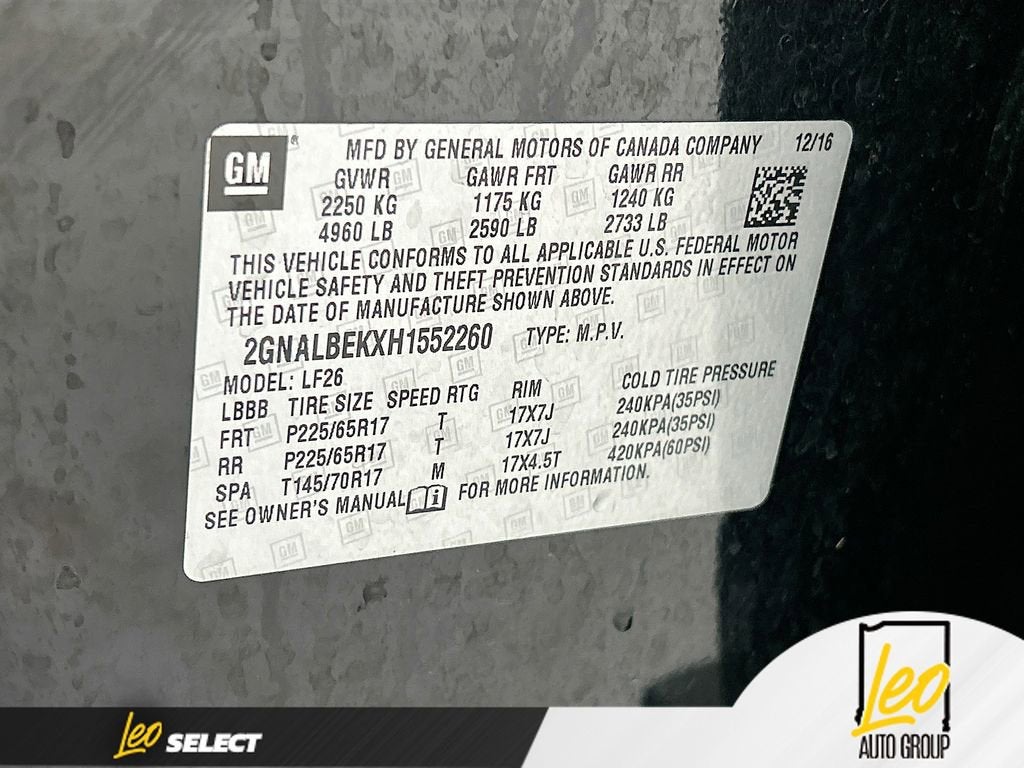2017 Chevrolet Equinox LSBlack 2.4L 4-Cylinder SIDI DOHC VVT FWD 6-Speed Automatic with OverdriveCertification Program Details: This vehicle has completed our 121-point Leo Select inspection and meets our standard for well-maintained, high-quality pre-owned cars. Mechanical and safety items are addressed as needed, and cosmetic improvements may be performed according to our reconditioning guidelines. These vehicles represent the core of our inventory—solid condition, confidently reconditioned, and transparently documented so you know exactly what you're getting.Preferred Equipment Group 1LS. Awards:* JD Power Dependability Study * 2017 KBB.com 10 Most Awarded Brands**LEO CHEVROLET - LOCATED AT 4105 W 96TH ST, INDIANAPOLIS, IN 46268* Take advantage of our VIP Test Drive Experience by contacting us at 317-872-3315 to schedule a test drive. Leo Chevrolet delivers a modern, hassle-free buying and service experience built around transparency, trust, and making it easy for every customer who walks through our doors. We are proud to serve guests in Indianapolis, Zionsville, Carmel, Fishers, Noblesville, Greenwood, Avon, and all surrounding Central Indiana areas.Additional $251.05 doc fee, tax, title, and registration are not included in the advertised sale price. We take every effort to ensure the advertised pricing information is accurate, however, we recommend you contact the dealership to confirm pricing information and inventory.